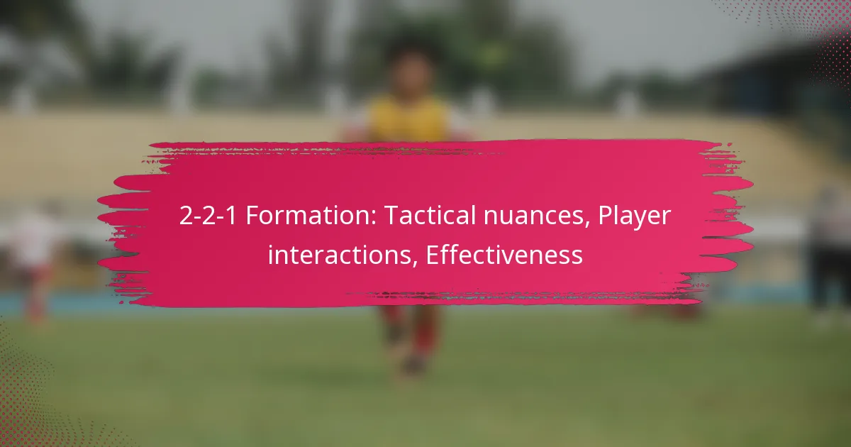 The 2-2-1 formation is a tactical arrangement that features two defenders, two midfielders, and one forward, designed to create a balance between defense and offense. This structure not only facilitates effective ball control and transition play but also enhances space management, allowing teams to adapt their strategies against different opponents. Understanding the distinct roles and interactions of players within this formation is essential for optimizing its effectiveness in various game scenarios.